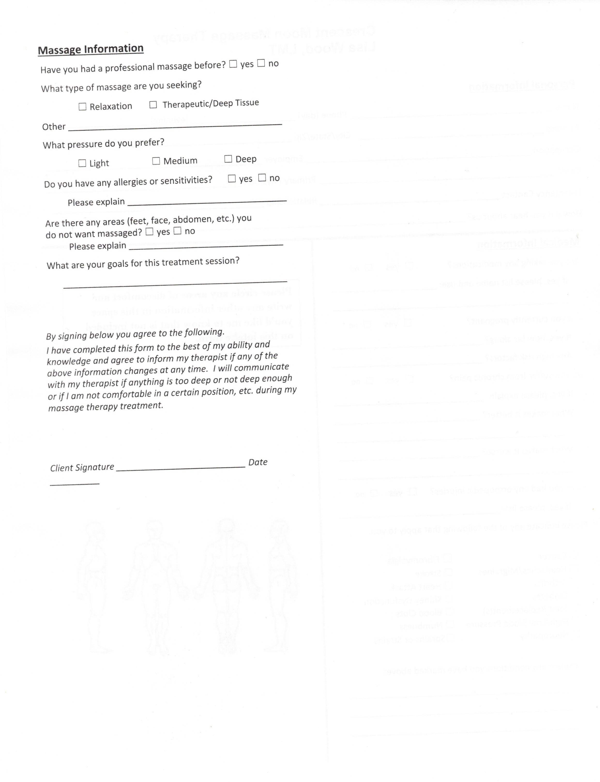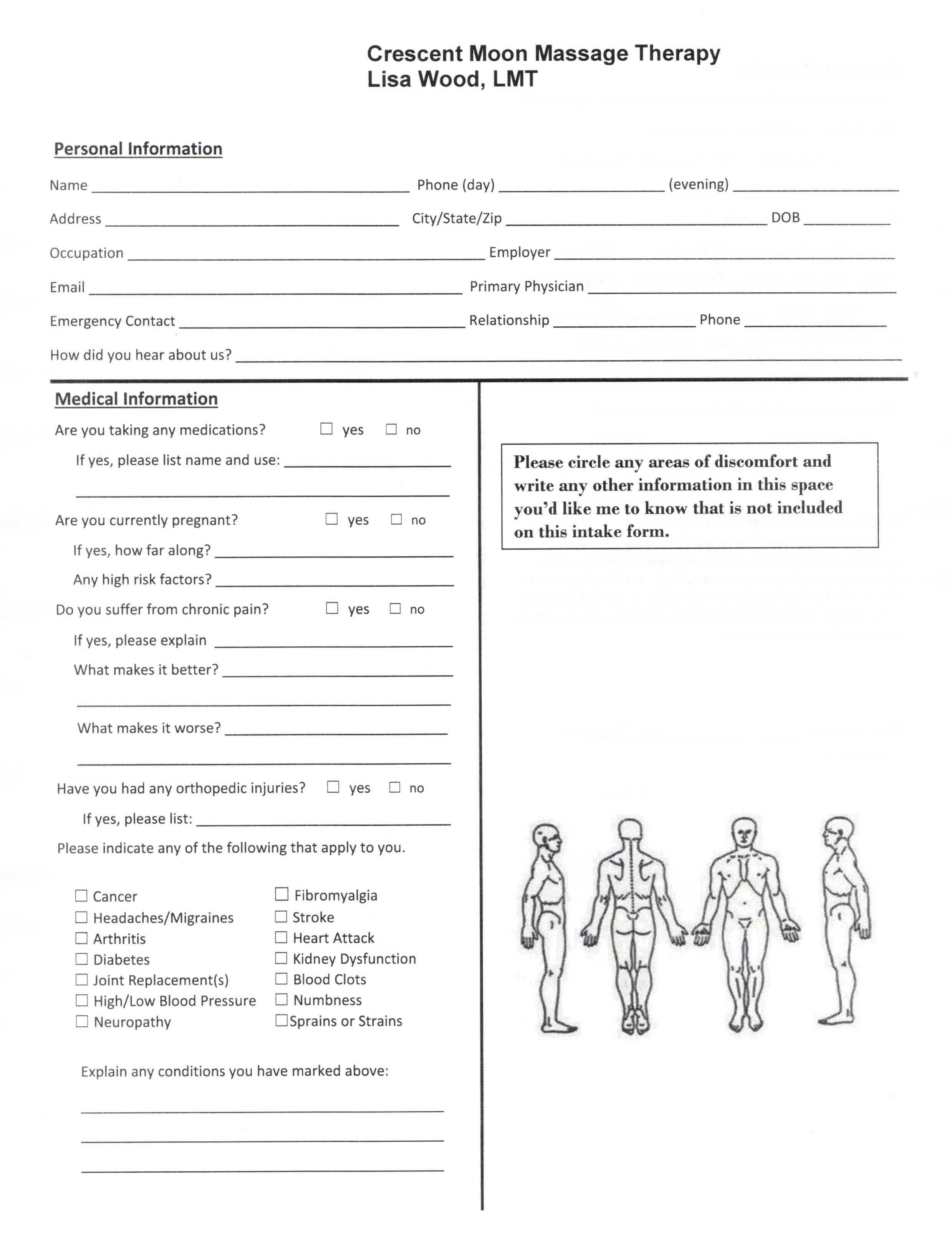 If you are a new client, please download and fill out all 3 forms on this page and bring to your appointment with you. Please note in Policies of Crescent Moon there are some changes: The waiting room is now open so disregard what the form says about the waiting room being closed. The mask mandate has been lifted for healthcare so masks are no longer required. I do have masks, if you'd like me to wear one. These are the only changes to the "Policies of Crescent Moon" intake form.